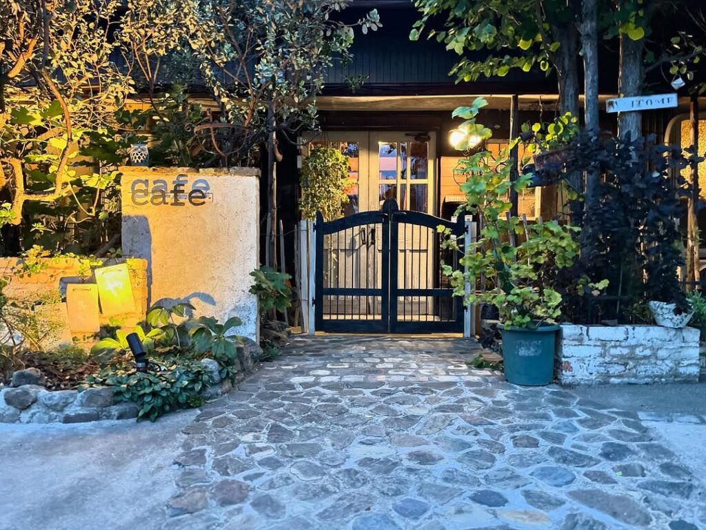 店舗(カフェ)看板の門柱と、それを導くアプローチ